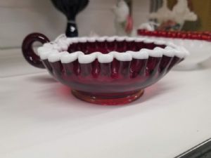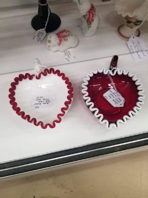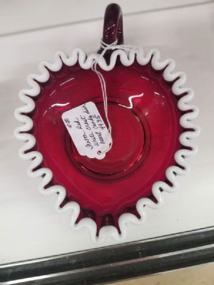 Fenton Red White Crest Heart Shaped Candy DishWe appreciate you shopping with us on our online store and we are happy to ship these items to any location in the United States. You are also welcome to shop with us at our storefront location which is: The Junk Shun Barn Flea Market Antique Mall 4242 HWY 65 South Harrison, AR 72601 If you'd like to save on shipping you are welcome to pick up on site as well. If you need to know more about an item feel free to contact us at 870-743-6865. $49.95